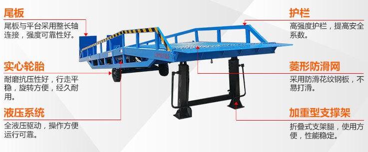 棗莊登車橋-集裝箱裝卸過橋-裝車斜坡登高裝貨叉車液壓登車橋-移動式液壓登車橋應用于無裝卸設備的貨臺及流動裝卸場所,是與叉車配合使用的貨物裝卸輔助設備。借助該設備,叉車能直接駛入汽車車廂內部進行批量裝卸作業(yè)。只需單人操作,不需要動力電源,即可實物的安全快速裝卸。即可使您減輕勞動強度,又能成倍提高裝卸作業(yè)效率,加快物料流通速度,獲取更大經濟效.臺面使用特制的菱形網絡板有可靠的強度,能保證長期使用而。它的菱形網狀結構,充分保證了防滑性能,使叉車有更好的爬坡性和可操作性。即使在雨、雪罐子。仍能保證正常使用。