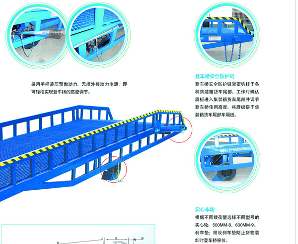 移動(dòng)式登車橋是與叉車配合使用的貨物裝卸輔助設(shè)備,可根據(jù)貨車車廂的高低調(diào)節(jié)高度,叉車可以直接通過(guò)本設(shè)備駛?cè)胲噹麅?nèi)部進(jìn)行貨物的批量裝卸,僅需單人作業(yè),即可實(shí)現(xiàn)貨物的快速裝卸。它的菱形網(wǎng)狀結(jié)構(gòu),充分保證了卓越的防滑性能,使叉車有極好的爬坡性和可操縱性。即使在雨、雪天氣,仍能保證正常使用。它的可調(diào)節(jié)長(zhǎng)度的索鏈能方便地鉤住貨車,使登車橋與貨車始終緊密貼合。采用手搖液壓泵作動(dòng)力,不需外接動(dòng)力電源即可輕松實(shí)現(xiàn)登車橋的高度調(diào)節(jié)。配置的剎車墊可有效防止貨車裝卸時(shí)登車橋移位。